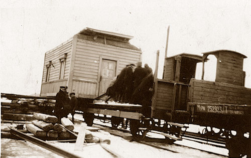 Rahumäe vana ajutise jaamahoone üleviimine Kivimäele, 1931. Foto: Ajapaik