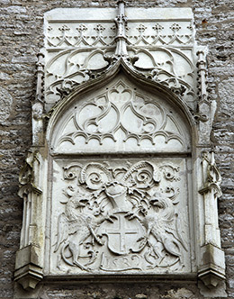 Suure Rannavärava vapikivi (Suure Gildi, 15.–16. sajandist väikse linnavapi kujutisega.) Kilpi hoiavad mõlemalt poolt lohed. 1529/1539? Ervin Sestvergi foto