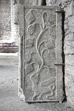 Lohe viinamarjaväädiga. 16. saj algus. Leitud 1931 Viru tn 11 maja lammutamisel. Kahe poolega raidkivi, mille ühel küljel on lohe, teisel draakoni kujutis.