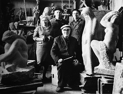 Skulptor Anton Starkopfi ateljees 1962. aastal Tartus. Robert-Rudolf taga keskel. Ees Starkopf prillide ja baretiga.