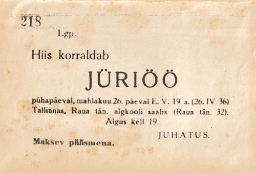 Kutse Jüriöö ülestõusu aastapäeva tähistamiseks aastast 1936.