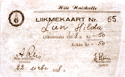 Ühenduse Hiie Naiskolle liikmekaart 1938.