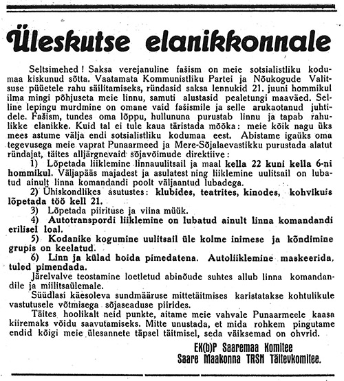 Sirvides 1941. aasta suvel ilmunud ajalehte Saarte Hääl, leiame sealt kõikvõimalikke käske, korraldusi ja üleskutseid, millega okupatsioonivõimud ja nende käsilased saarlased lausa üle külvasid.