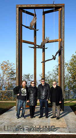 Mälestusmärk „Umsiedlung” rajaja Tõnis Kaasik koos abikaasa Ehaga, vasakul skulptor Seaküla Simson ning paremal arhitekt Kalle Rõõmus.