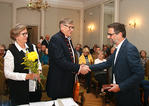 pühendatud ajalookonverents. Fotol: Eha ja Tõnis Kaasik tänavad David Feesti (Nordost-Institut Lüneburg), kelle ettekande teema oli „Eesti ja Saksamaa vahel. Pankur Klaus Scheel ja baltisakslaste ümberasumine“. Foto: erakogu